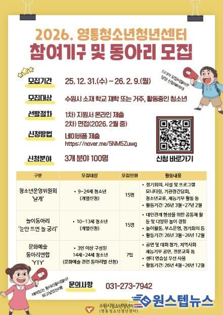 원스텝뉴스 이병희 기자 | 수원시청소년청년재단 영통청소년청년센터가 2026년 활동에 함께할 청소년 참여기구 및 동아리 참가자를 모집한다. 모집 대상은 청소년운영위원회, 놀이동아리, 문화예술동아리연합 총 3개 분야이며, 선발 인원은 약 100명이다.