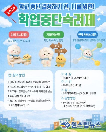 원스텝뉴스 이병희 기자 | 군포시청소년재단 군포시학교밖청소년지원센터는 2025년 학업중단숙려제에 참여한 청소년 19명 중 14명이 학교 복귀를 결정하며, 학업을 지속하기로 했다고 밝혔다.