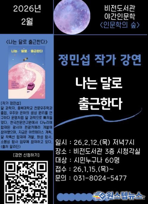 원스텝뉴스 천규영 기자 | 평택시 비전도서관은 오는 2월 12일 저녁 7시 달 과학자 정민섭 작가를 초청하여 ‘나는 달로 출근한다’를 주제로 야간 인문학 강연을 진행한다.