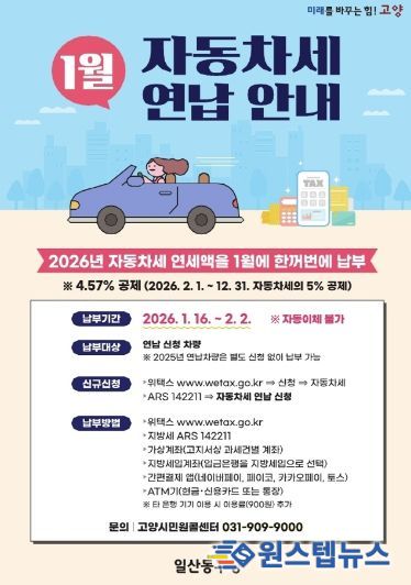 원스텝뉴스 이병희 기자 | 고양특례시 일산동구 세무과는 1월에 자동차세를 연납하면 1년 세액의 약 4.5%를 공제받을 수 있는 연납 신청기간을 1월 한 달간 운영한다고 밝혔다.