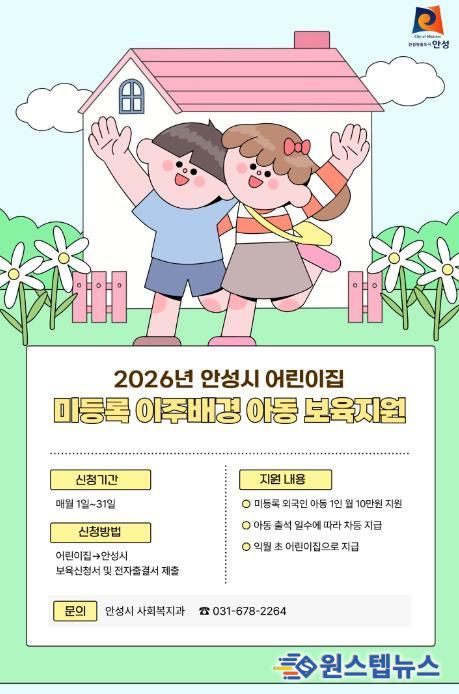 원스텝뉴스 이병희 기자 | 안성시는 2026년부터 어린이집에 다니는 미등록 외국인(이주배경) 영유아에게 월 10만원의 보육지원금을 지원한다고 밝혔다.
