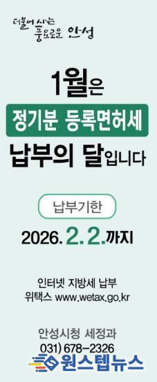 안성시 관계자는 “등록면허세 납부기한은 2월 2일까지로, 납기 마지막 날에는 민원인이 몰려 혼잡하거나 온라인 접속이 지연될 수 있으므로 조기 납부를 부탁드린다”고 당부했다.