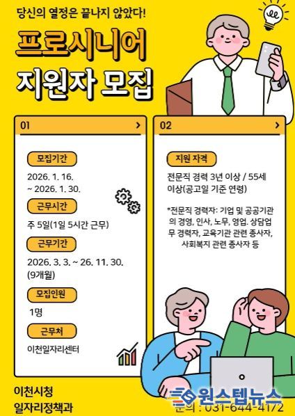 이천시 관계자는 “이번 프로시니어 모집은 경험 많은 중장년 인력이 지역 일자리 정책의 중요한 연결고리 역할을 하게 될 것”이라며 “전문성과 책임감을 갖춘 분들의 많은 관심과 참여를 바란다”라고 말했다.
