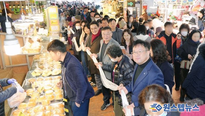 원스텝뉴스 이병희 기자 | 수원 못골종합시장이 새해를 맞아 16일 전통시장 상인과 시민이 함께하는 ‘가래떡 나눔 행사’를 열었다.