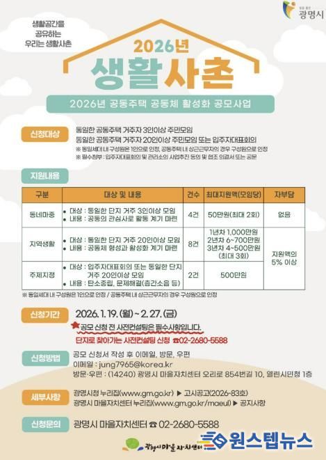 시는 공동주택 이웃 간 관계 회복과 생활권 중심 공동체 문화 확산을 위해 ‘2026년 광명시 생활사촌 공동주택 공동체 활성화 공모사업’ 참여자를 오는 2월 27일까지 모집한다.