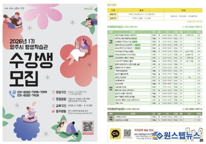 원스텝뉴스 이병희 기자 | 양주시가 시민들의 다양한 학습 수요를 반영해 1월 20일(화)부터‘2026년 1기 양주시 평생학습 프로그램’수강생을 모집한다.