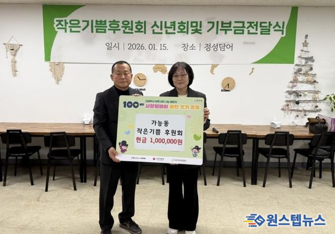 원스텝뉴스 이병희 기자 | 의정부시 가능동주민센터는 1월 15일 작은기쁨후원회가 ‘100일간 사랑릴레이 배턴 잇기’에 동참하며 성금 100만 원을 기탁했다고 밝혔다.