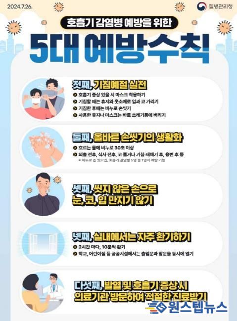 호흡기 감염병의 발생과 전파 예방을 위해서는 △ 접종 시기에 맞춰 예방접종 실시 △ 흐르는 물에 30초 이상 올바른 손씻기 △ 기침할 때 옷소매로 입과 코 가리기 △ 실내에서 자주 환기하기 △ 증상 발생 시 의료기관 방문해 진료받기 등 예방수칙을 준수하는 것이 중요하다.