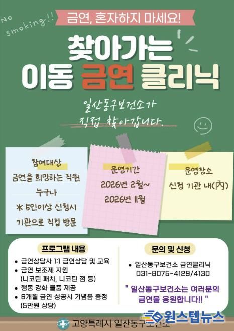 원스텝뉴스 이병희 기자 | 고양특례시 일산동구보건소는 보건소 방문이 어려운 직장인 흡연자를 대상으로 ‘찾아가는 금연클리닉’을 운영한다고 19일 밝혔다.