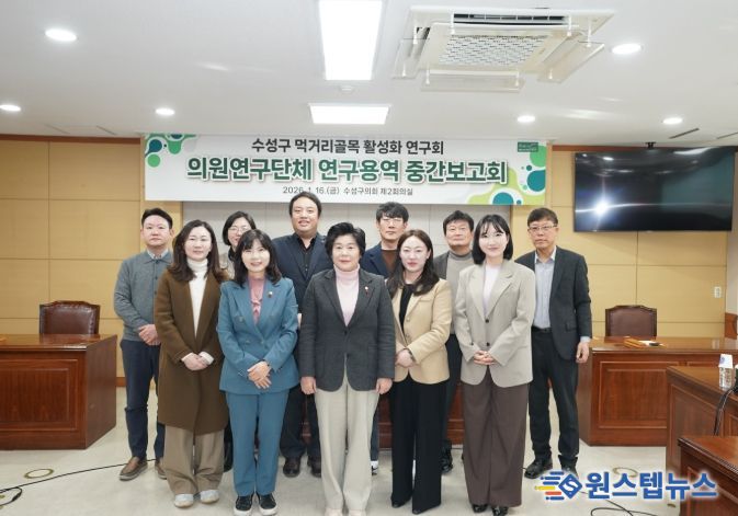 원스텝뉴스 이병희 기자 | 수성구의회 의원연구단체인 ‘수성구 먹거리골목 활성화 연구회(회장 정대현 의원, 남정호ㆍ김중군ㆍ김재현ㆍ정경은ㆍ최명숙 의원)’는 지난 16일 의회 2층 회의실에서 '수성구 먹거리골목 활성화 모델 마련' 연구용역 중간보고회를 개최했다.