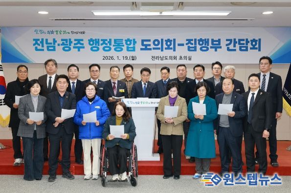 원스텝뉴스 이병희 기자 | 전라남도의회는 19일 도의회에서 김영록 전라남도지사와 김대중 전라남도교육감이 참여한 가운데 ‘전남·광주 행정통합 도의회–집행부 간담회’를 열고, 통합 추진 방향과 주요 쟁점에 대해 심도 있는 논의를 진행했다.