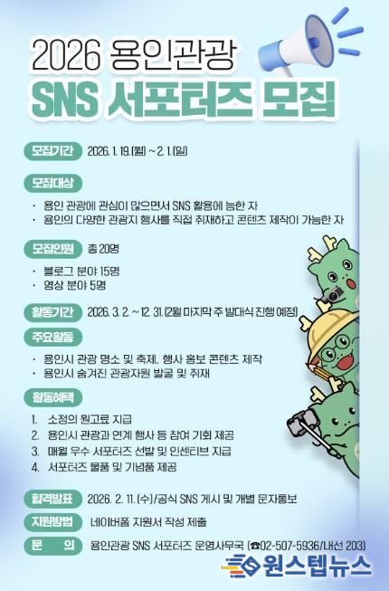 원스텝뉴스 이병희 기자 | 용인특례시는 2월 1일까지 용인의 관광자원과 다채로운 축제·행사를 시민의 시각에서 생동감 있게 홍보할 ‘용인관광 SNS 서포터즈’를 모집한다고 20일 밝혔다.