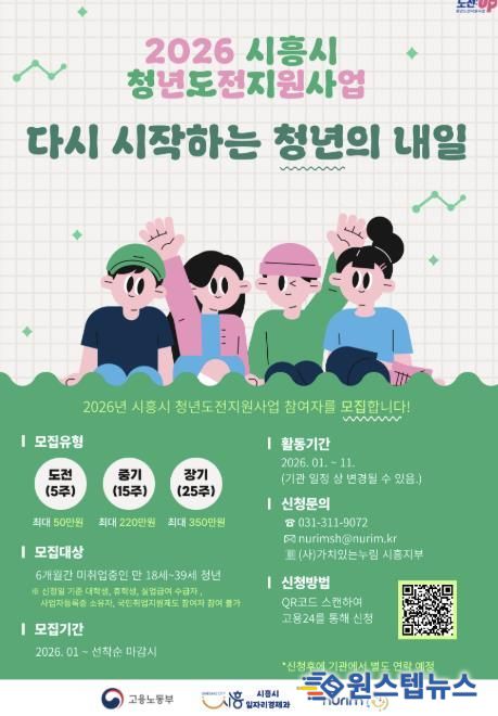 원스텝뉴스 이병희 기자 | 시흥시는 취업과 사회 진출에 어려움을 겪고 있는 청년들의 재도전을 지원하기 위해 ‘2026년 청년도전지원사업’ 참여자 156명을 모집한다.
