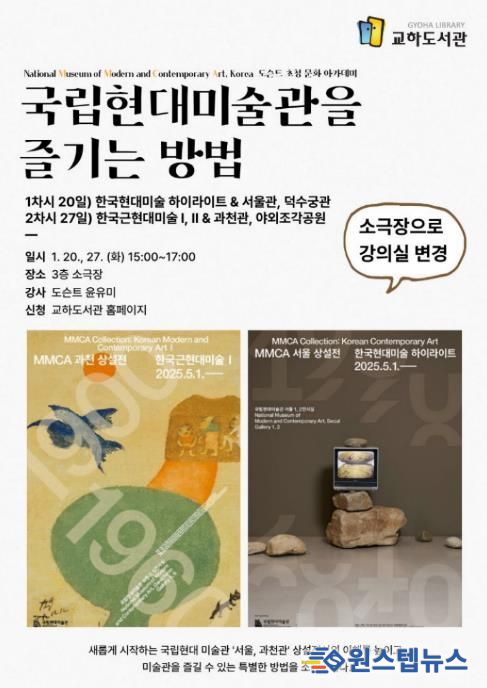 원스텝뉴스 이병희 기자 | 파주시 교하도서관은 오는 20일과 27일, 15시부터 17시까지 교하도서관 3층 소극장에서 전문 안내원(도슨트) 초청 강연 프로그램 ‘국립현대미술관을 즐기는 방법’을 운영한다.