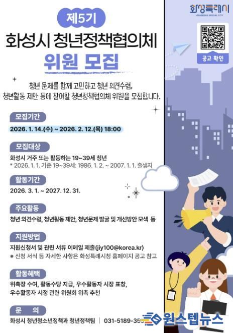 원스텝뉴스 이병희 기자 | 화성특례시는 다음 달 12일까지 ‘제5기 화성시 청년정책협의체 위원’을 모집한다고 19일 밝혔다.