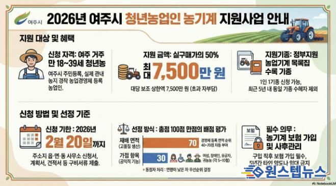 원스텝뉴스 이병희 기자 | 여주시는 청년농업인의 안정적인 영농 정착과 경영 기반 강화를 위해 '2026년 청년농업인 농기계 지원사업'을 추진한다.