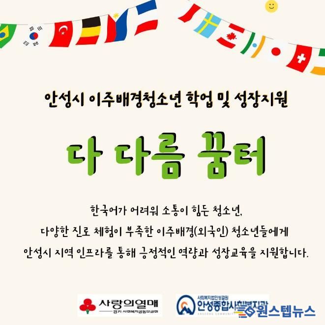 원스텝뉴스 이병희 기자 | 안성종합사회복지관은 경기사회복지공동모금회 지원으로 이주배경(외국인) 청소년 대상 학업·사회적응 지원사업 ‘다다름 꿈터’ 참여자를 1월 28일까지 모집한다.