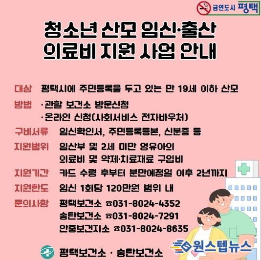 원스텝뉴스 이병희 기자 | 평택시는 임신과 출산을 준비하는 청소년 산모의 건강한 출산과 경제적 부담 완화를 위해 ‘청소년 산모 의료비 지원 사업’을 적극 추진하고 있다고 밝혔다.