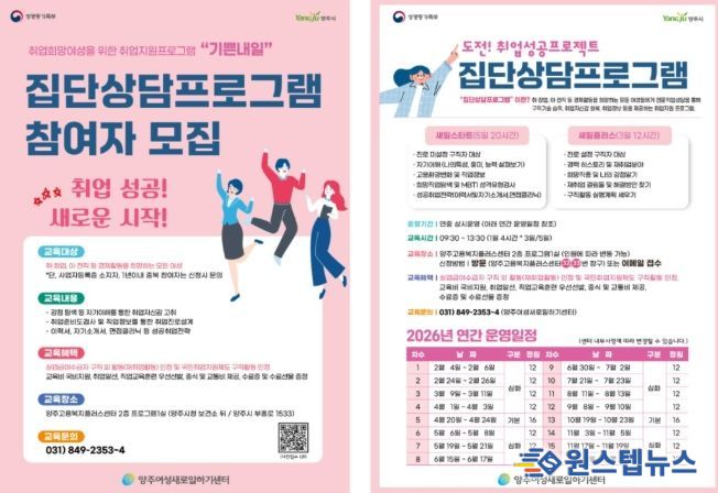 원스텝뉴스 이병희 기자 | 양주시 양주여성새로일하기센터가 취업을 희망하는 여성들을 대상으로 ‘2026년 집단상담프로그램’참여자를 모집한다.