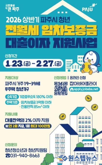 원스텝뉴스 이병희 기자 | 파주시는 청년가구의 주거비 부담을 완화하기 위한 청년 전월세 임차보증금 대출이자 지원사업 신청을 오는 1월 23일부터 2월 27일까지 받는다.