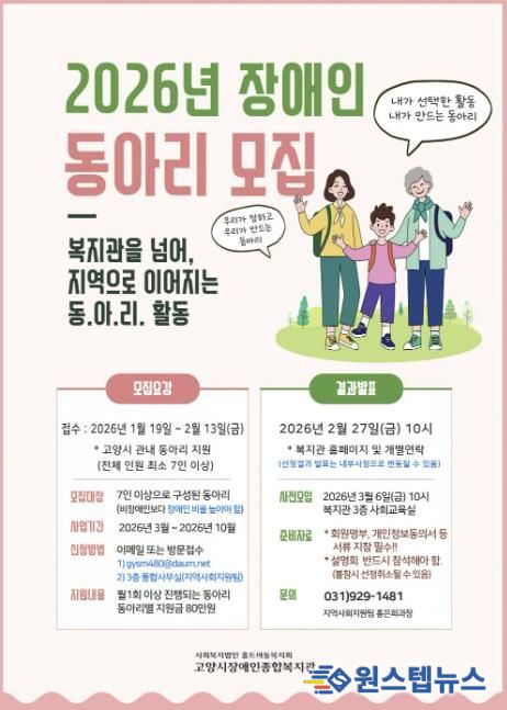 원스텝뉴스 이병희 기자 | 고양시장애종합복지관은 장애인이 주체가 되어 문화·여가 활동을 기획하고 운영할 수 있도록 지원하는 ‘2026년 장애인동아리지원사업’에 참여할 동아리를 모집한다.
