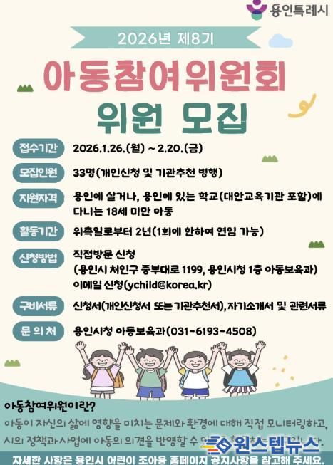 원스텝뉴스 이병희 기자 | 용인특례시는 1월 26일부터 2월 20일까지 아동정책 수립 과정에 적접 참여할 ‘제8기 아동참여위원회‘ 위원 33명을 모집한다.