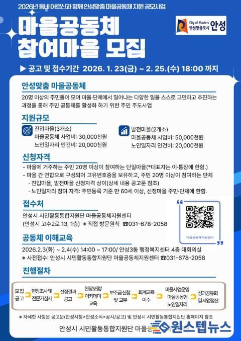 이번 공모는 ▶'2026년 동네 어르신과 함께하는 안성맞춤 마을공동체 지원'과 ▶'2026년 안성맞춤 시민동아리 지원' 등 2개 분야로 진행된다.