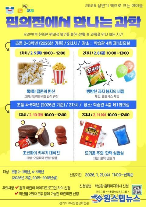 2월 5일부터 11일까지 운영되는 이번 프로그램은 어린이들이 일상에서 쉽게 접하는 편의점 물건을 통해 과학적 사고력과 탐구 능력을 키우고 즐거운 학습 경험을 제공하고자 마련됐다.