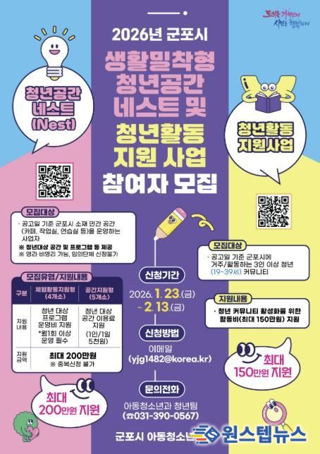 원스텝뉴스 이병희 기자 | 군포시는 지역 청년들의 다양한 활동을 지원하는 생활밀착형 청년공간 ‘네스트(Nest)’ 및 청년활동지원 사업 참여자를 2월 13일까지 각각 모집한다.