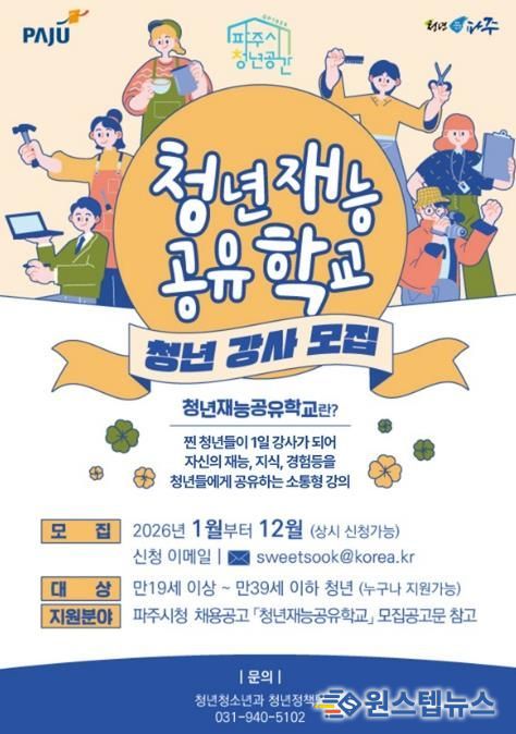 원스텝뉴스 이병희 기자 | 파주시는 2026년 1월부터 12월까지 청년을 대상으로 '청년재능공유학교' 청년강사를 연중 상시 모집한다.