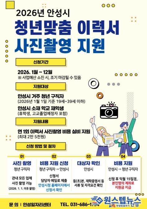 원스텝뉴스 이병희 기자 | 안성시는 관내 청년 구직자의 성공적인 취업을 지원하기 위해 ‘청년맞춤 이력서 사진 촬영’ 지원 사업을 시작한다.