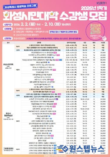 원스텝뉴스 이병희 기자 | 화성특례시는 2026년 1학기 화성시민대학 수강생을 다음 달 2일부터 10일까지 선착순 모집한다고 27일 밝혔다.