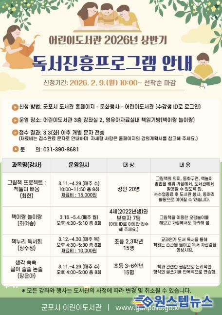 원스텝뉴스 이병희 기자 | 군포시 어린이도서관은 오는 3월부터 새학기를 맞은 어린이들이 책 읽기의 즐거움과 성취감을 느끼고 꾸준한 독서활동으로 기초 학력을 향상시킬 수 있도록 2026년 봄학기 독서 진흥프로그램을 운영한다고 밝혔다.