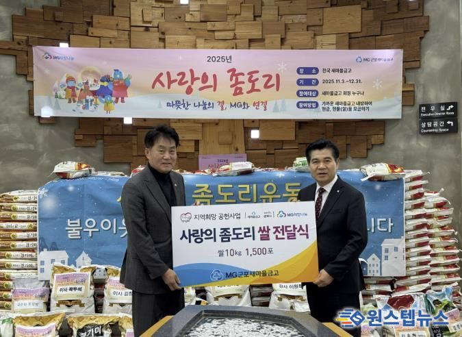 ‘사랑의 좀도리쌀’ 행사는 MG군포새마을금고와 군포시가 함께 하는 지역희망공헌사업으로 1989년부터 시작해 올해로 38회째를 맞았다. MG군포새마을금고는 지난해와 동일하게 총 1,500포(1포 10㎏)의 쌀을 지원해 추운 겨울을 보내는 이웃들에게 온기를 전했다.