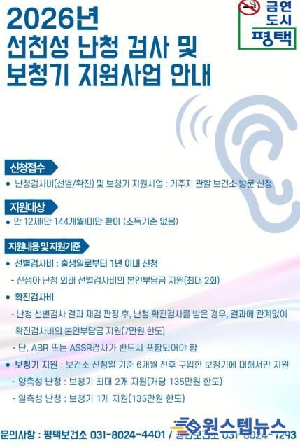 원스텝뉴스 이병희 기자 | 평택시는 성장기 아동의 청력 보호와 적기 치료 지원을 위해 보청기 지원사업의 대상을 기존 만 5세 미만에서 만 12세 미만까지 확대 시행한다고 밝혔다.