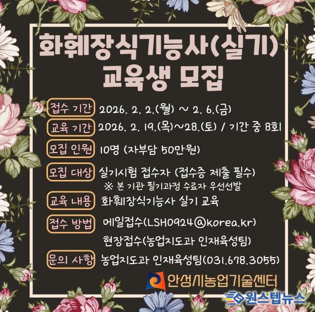 원스텝뉴스 이병희 기자 | 안성시농업기술센터는 오는 2월 2일부터 2월 6일까지 화훼장식기능사 실기반 교육생을 모집한다고 밝혔다.
