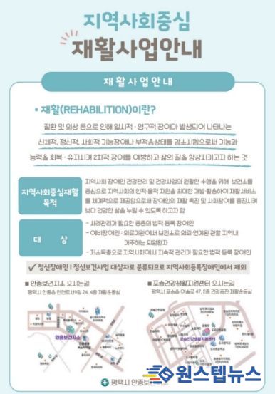원스텝뉴스 이병희 기자 | 평택시 안중보건지소는 법적 등록 장애인과 예비장애인(손상이나 질병 발생 후 완전한 회복이 어려워 일정 기간 내 장애인이 될 것으로 예상되는 자) 및 지역 주민을 대상으로 체계적이고 전문적인 재활서비스 제공을 위해 재활운동실 운영과 지역사회 중심 재활사업을 추진하고 있다.
