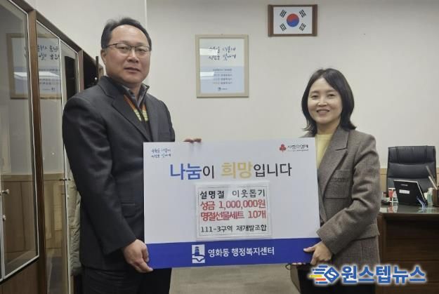 원스텝뉴스 이병희 기자 | 수원시 장안구 영화동 111-3구역 주택재개발정비사업조합이 지난 28일, 설 명절을 맞아 영화동 행정복지센터에 130만원 상당의 후원금품을 전달했다.