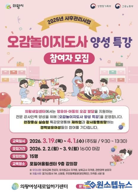 원스텝뉴스 이병희 기자 | 의왕시 여성새로일하기센터가 '오감놀이지도사 양성 특강'의 교육생을 모집한다.