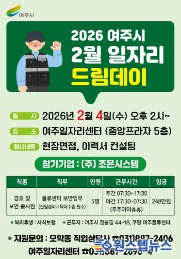 원스텝뉴스 이병희 기자 | 여주시는 오는 2월 4일 오후 2시 여주일자리센터(세종로 14번길 18, 중앙프라자 5층)에서 ‘2026년 2월 여주시 일자리드림데이’를 연다.