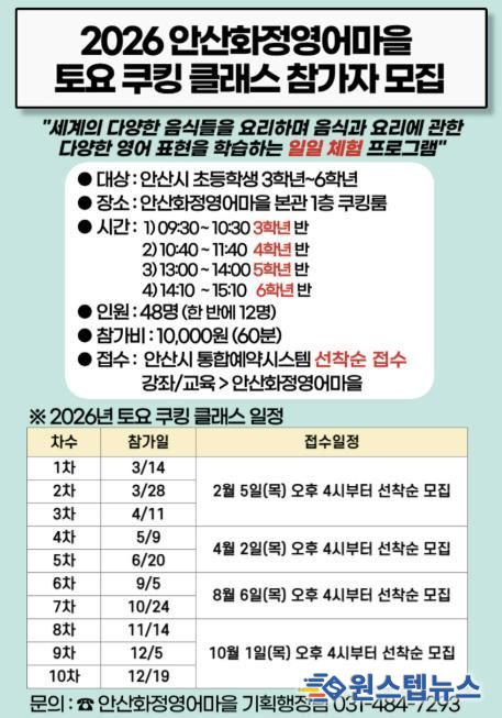 민진영 안산화정영어마을 원장은 “토요 쿠킹 클래스는 높은 만족도와 수요를 기록해 온 영어마을의 대표 프로그램 중 하나”라며 “관심 있는 학생들의 많은 참여를 바란다”고 당부했다.