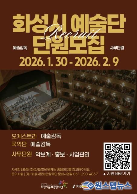 원스텝뉴스 이병희 기자 | (재)화성시문화관광재단은 2026년 ‘화성시 예술단’을 이끌어갈 예술감독과 사무단원을 모집한다.