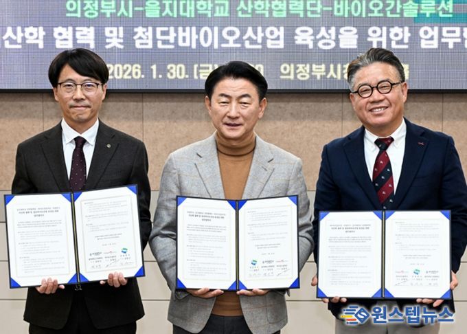 의정부시는 1월 30일 시청 회룡홀에서 을지대학교 산학협력단(단장 김인식), ㈜바이오간솔루션(대표 송명석)과 ‘지산학 협력 및 첨단 바이오산업 육성을 위한 업무협약’을 체결했다.