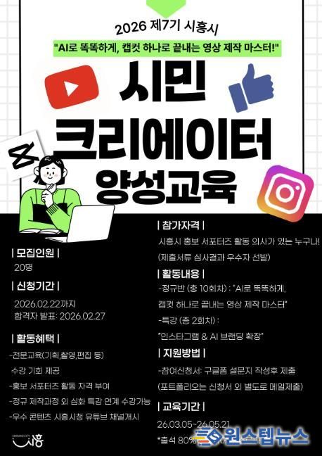 원스텝뉴스 이병희 기자 | 시흥시는 시민 참여형 홍보를 활성화하고 시민이 만드는 콘텐츠를 발굴ㆍ확산하기 위해 ‘2026 제7기 시민 크리에이터(창작자) 양성 교육’을 운영하는 가운데 참가자 20명을 2월 2일부터 22일까지 모집한다.