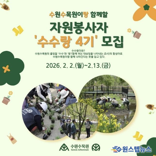 원스텝뉴스 이병희 기자 | 수원특례시는 수원수목원(일월·영흥수목원) 운영을 함께할 자원봉사자 ‘수수랑’ 4기 60명(일반 40명, 해설 20명)을 2월 2일부터 13일까지 모집한다.