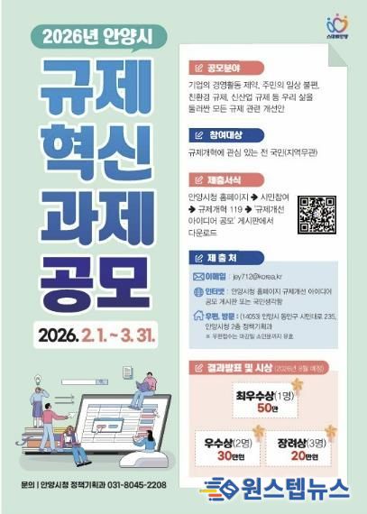 원스텝뉴스 이병희 기자 | 안양시는 시민이 직접 체감하는 규제혁신을 실현하고 다양한 규제개선 아이디어 발굴을 위해 오는 3월 31일까지‘2026년 안양시 규제혁신 과제 공모’를 진행한다고 2일 밝혔다.