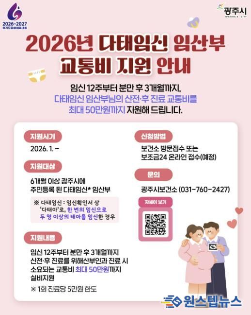 원스텝뉴스 이병희 기자 | 광주시는 2026년 1월부터 다태임신 임산부를 대상으로 교통비 지원사업을 새롭게 시행하며 고위험 임산부에 대한 맞춤형 지원을 강화한다고 2일 밝혔다.