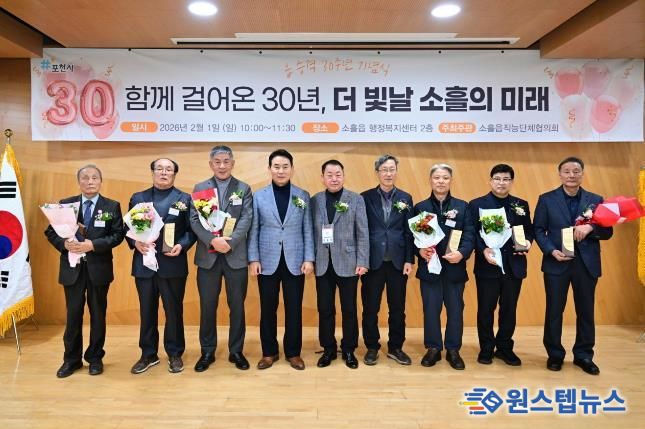 행사는 포천문화관광재단 민속예술단과 주민자치회 디스코장구팀의 식전 공연으로 시작됐으며, 이어 소흘읍 발전에 기여한 인사들에게 ‘자랑스러운 소흘인상’을 수여하고 2026년 첫 소흘읍 출생신고 가족에게 기념패를 전달하는 순으로 진행됐다. 이후 주민 설문조사를 바탕으로 선정된 지난 30년간의 주요 성과를 담은 영상이 상영돼 읍 승격과 택지지구 개발, 고속도로 개통, 지하철 개통 확정 등 소흘읍의 성장 과정을 되짚는 시간이 이어졌다.