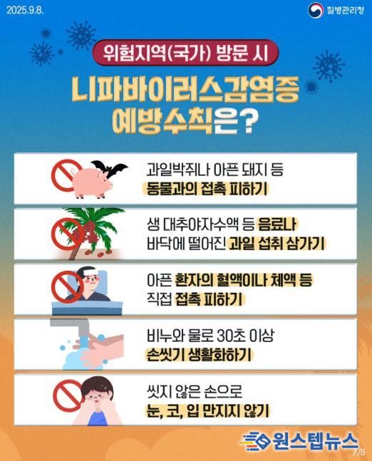 평택시 송탄보건소 관계자는 “니파바이러스 감염증은 사망률이 높지만 개인 위생수칙을 철저히 지키면 예방이 가능”하다며 해당 국가 여행 시 불필요한 병원 방문 자제, 동물 접촉 금지, 자주 손 씻기 등 개인위생 준수를 강조했다.