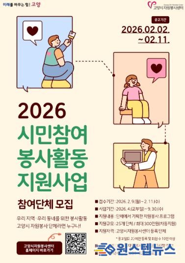 원스텝뉴스 이병희 기자 | 고양시자원봉사센터는 ‘2026 시민참여 봉사활동 지원사업’에 참여할 자원봉사 단체를 모집한다고 2일 밝혔다.